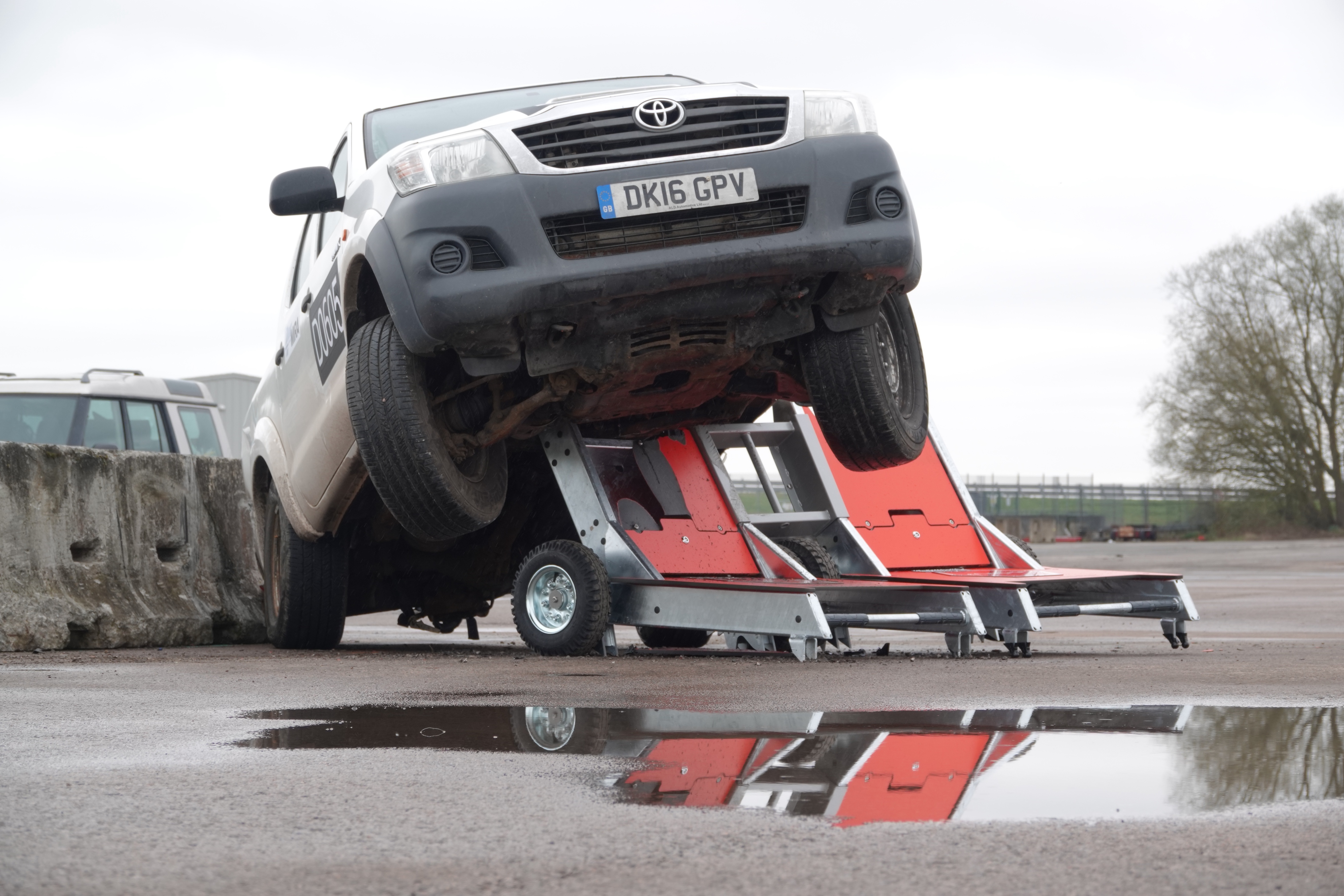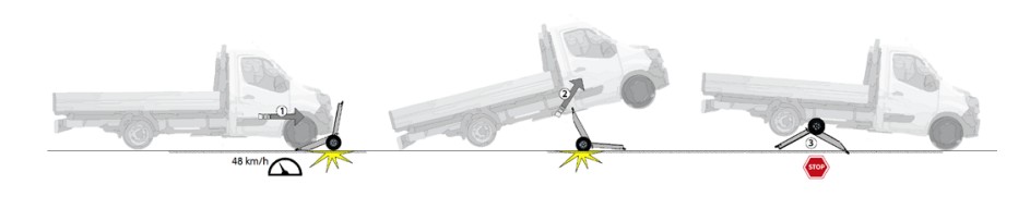 Il meccanismo di arresto agisce ribaltando il veicolo al contatto, alterando la traiettoria da orizzontale a verticale. Le ruote pneumatiche all-terrain con sistema di bloccaggio consentono la movimentazione su qualsiasi superficie e garantiscono la stabilità una volta posizionato.