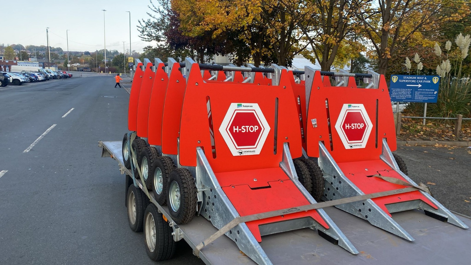 Le unità H-STOP vengono consegnate da Transenne.net in configurazione impilata a nido, ottimizzando lo spazio in fase di trasporto. Ogni unità viene portata in posizione da un singolo operatore grazie alle ruote pneumatiche all-terrain: nessun sollevamento, nessun attrezzo. Le ruote vengono bloccate per stabilizzare la barriera.